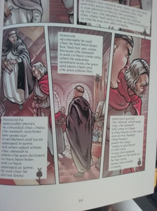If that’s true, then what does the realistic artstyle of Debating Truth indicate? One possibility is that the reader makes stronger judgements about the character, as they seem more distinct and less relatable. Thus, the depiction of the character’s body language is very important; you’re not supposed to relate to Nahmanides, but you are supposed to relate to how the Friar perceives him. The artist of the comic is allowed the liberty of deciding what body language would be fitting given the patronizing view the Christians have of him. He tends to look down a lot, as though in shame, as seen in figures 5 and 6 (Caputo 58-9).