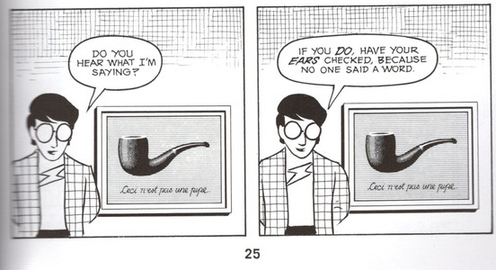 The visuals of the comic play a variety of important roles in the book, allowing McCloud to easily incorporate examples, demonstrate concepts, and reinforce points using visual metaphors. Like many academic works, Understanding Comics is saturated with references used to illustrate his point. Unlike text-based works, however, McCloud doesn’t need to pause and refer to “figure 4” to give an example. Because it is a comic, an image-heavy medium, he can pack in references to his subject matter (comics) whenever he wants. He can include a reference without even mentioning it, and it can still be noticed and enhance his point. The inclusion is seamless as well, because the images are blended with the explanation; they’re not forced to be separated like they are with text-based books, which have images and text in two different, defined spaces. This harmony of image and text also allows McCloud to demonstrate concepts at the same time he explains them. For example, on page 25, he discusses a painting called “The Treachery of Images,” and while doing so is constantly challenging the reader’s perception of what they are seeing. He heavily breaks the fourth wall by pointing out that his speech isn’t really speech; after all, it’s just ink on a page. In doing all this, he is revealing illustration’s magical power to make us translate symbolic representation into a real concept in our mind, even though it is nothing more than ink on paper. This kind of simultaneous explaining and demonstrating is possible with the written word, but it is more difficult, as it is only using one form of communication (writing), whereas comics use two (writing and illustration). Though McCloud uses this interplay to more thoroughly explain complex concepts, he also uses it in subtle ways to create visual metaphors, such as reinforcing the limitless potential of comics by drawing the expanse of space (McCloud 3). The visual nature of the medium allows concepts to be supported on multiple fronts, strengthening McCloud’s points and enhancing learning.